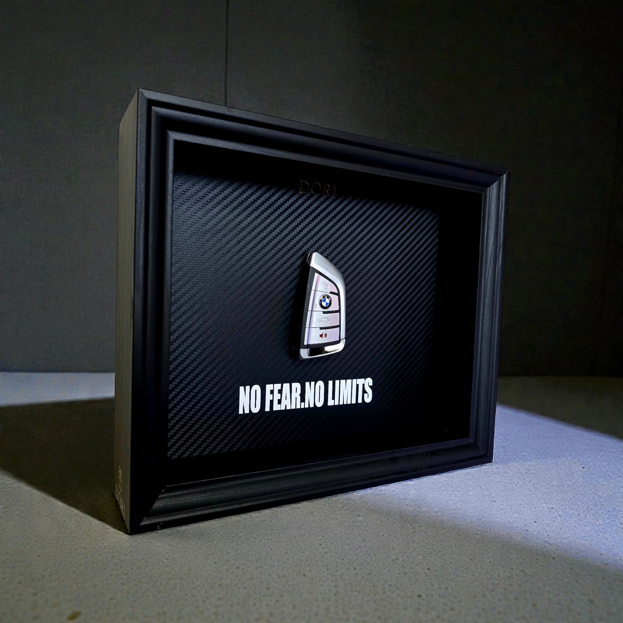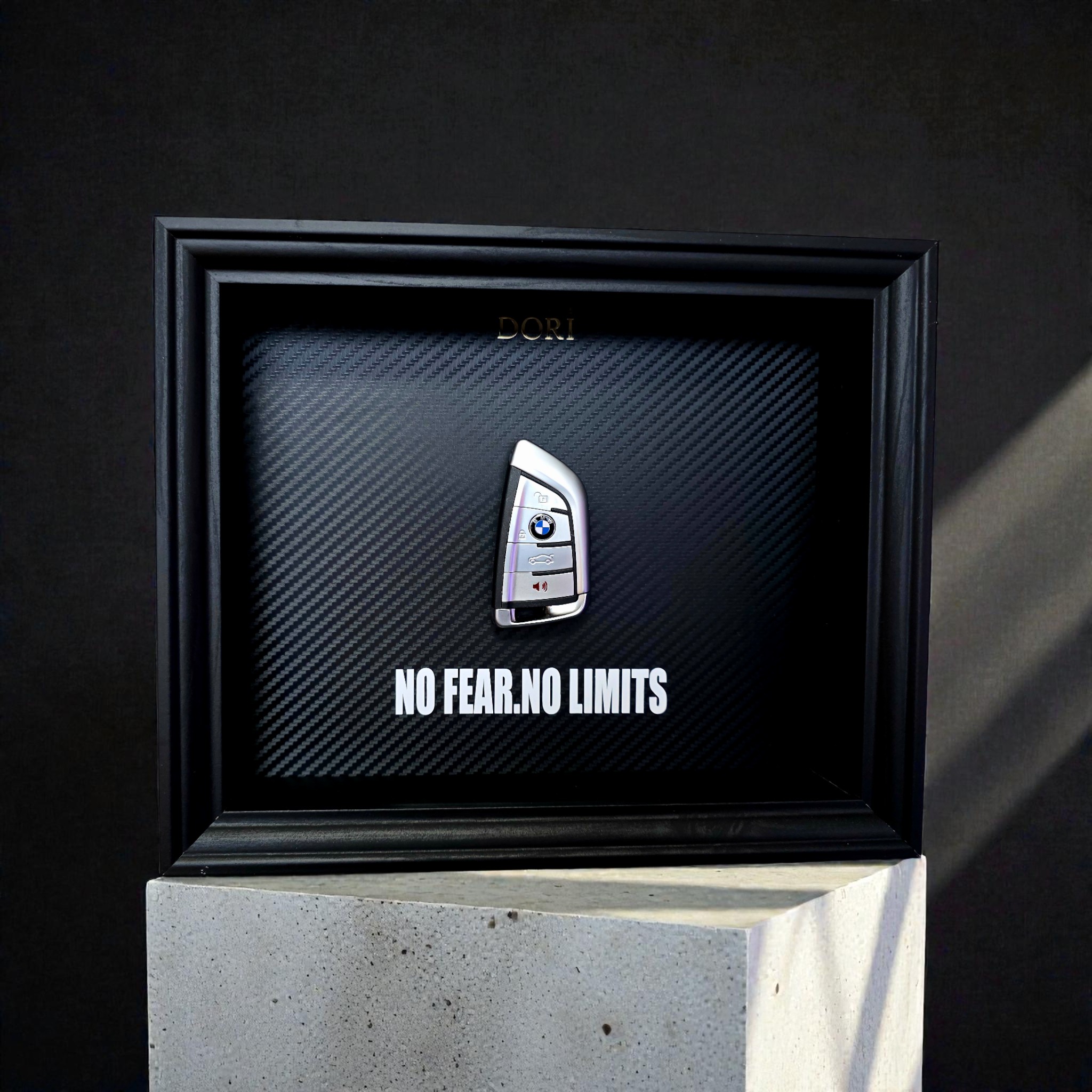 Automobilio raktelio dekoratyvinis paveikslas su anglies pluošto fonu ir užrašu „No Fear. No Limits“Paveikslas – Autoraktas BMW