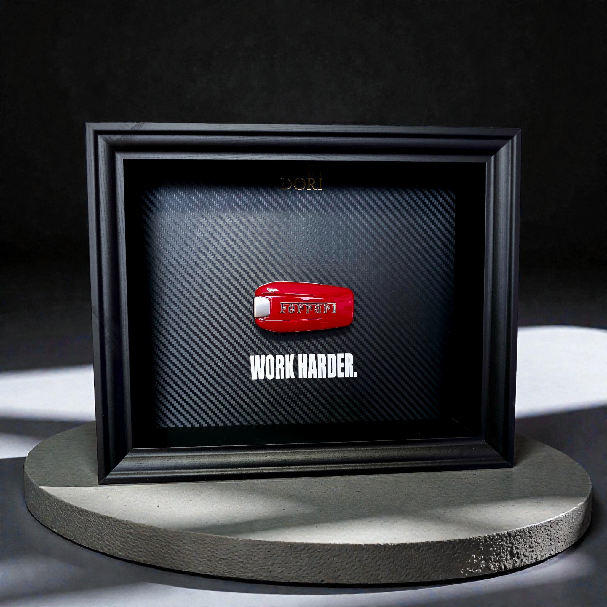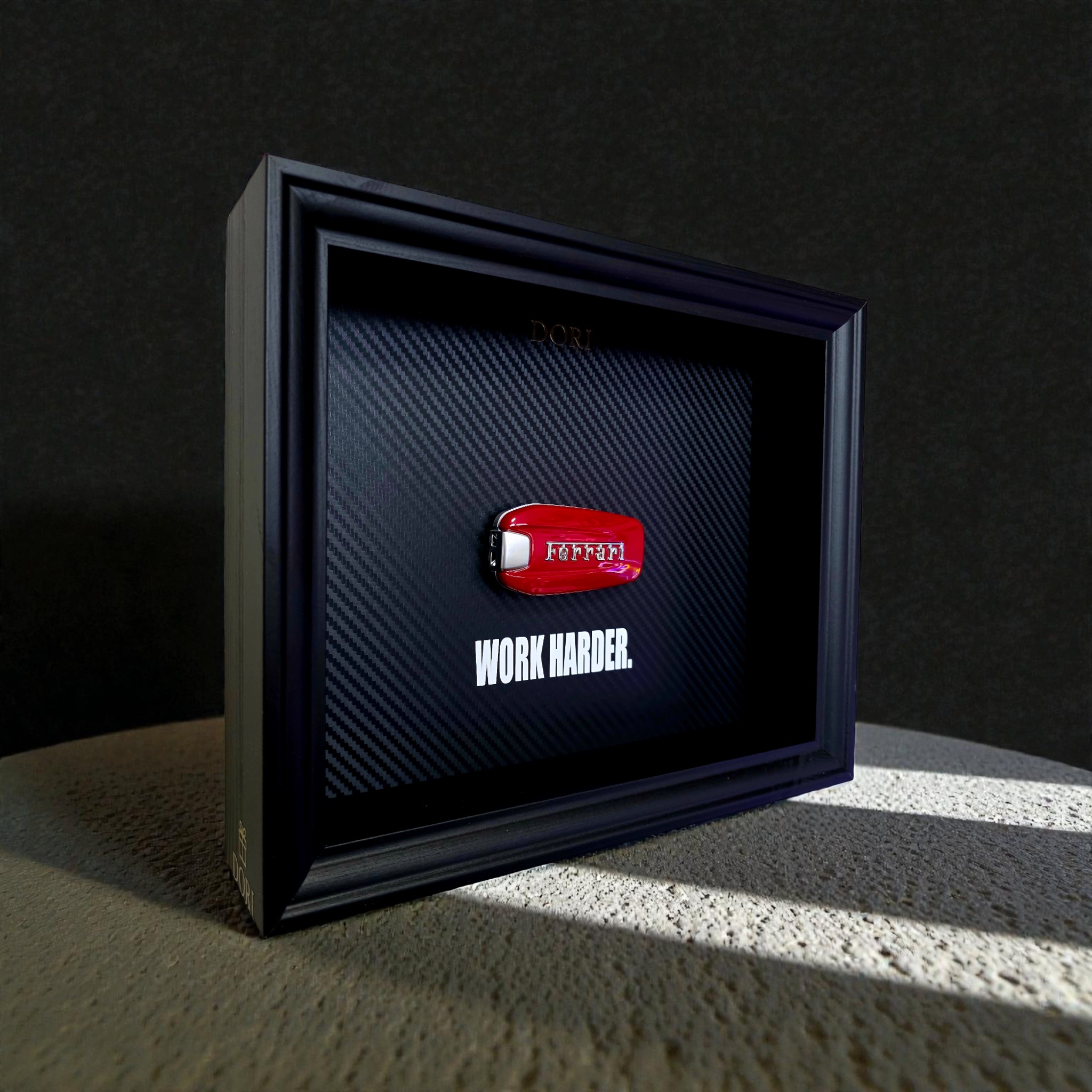 Šis DORI kolekcijos paveikslas su originaliu Ferrari raktu sukurtas ieškantiems išskirtinumo. Juodas, giliai profiliuotas rėmas, anglies pluošto imitacijos fonas ir nepriekaištinga kompozicija leidžia žinutei kalbėti pačiai už save – be perteklinių detalių, tik esmė: dirbk daugiau, siek daugiau, gauk daugiau.