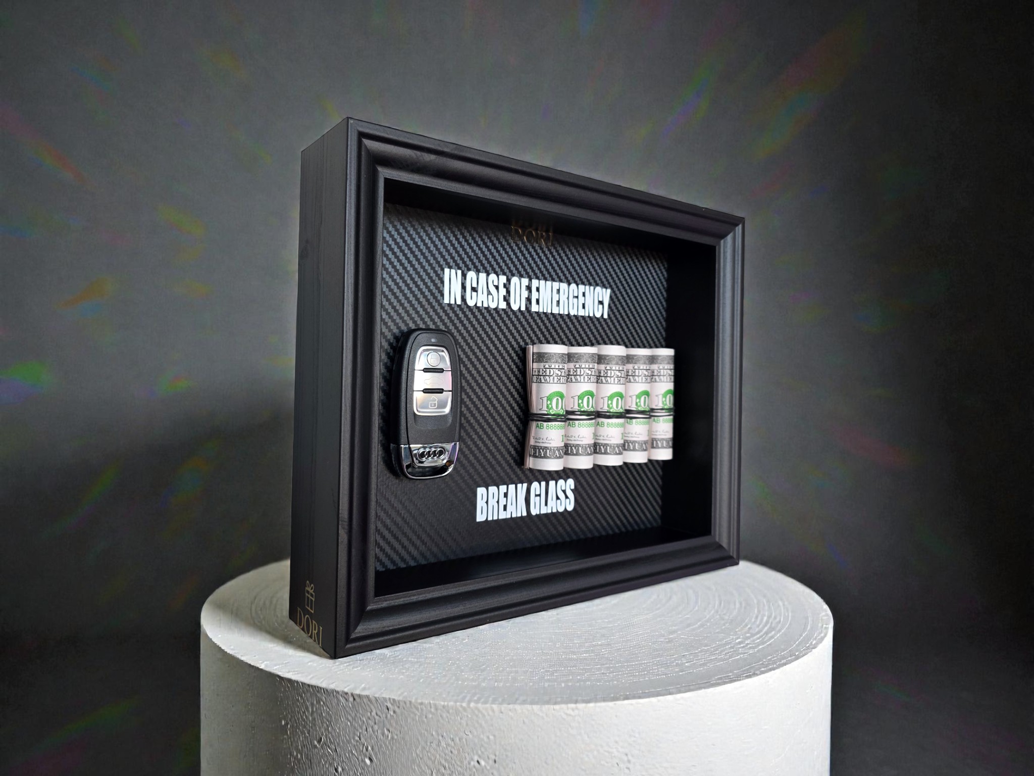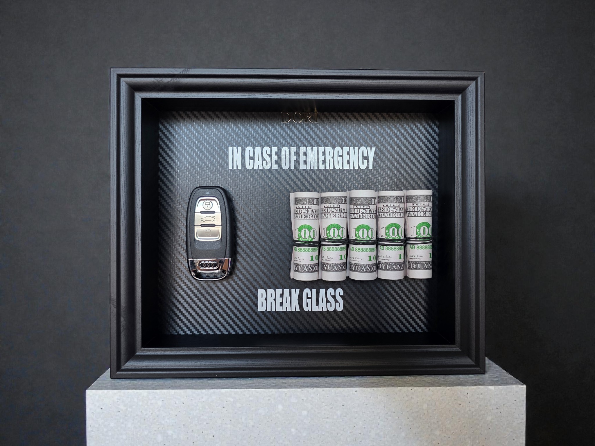 Motyvacinis DORI kolekcijos „Break Glass“ paveikslas su Audi automobilio rakteliu ir pinigų simbolika. Šis derinys perteikia kryptį, stabilumą ir ambiciją siekti daugiau, neatsisakant kokybės ir kontrolės.