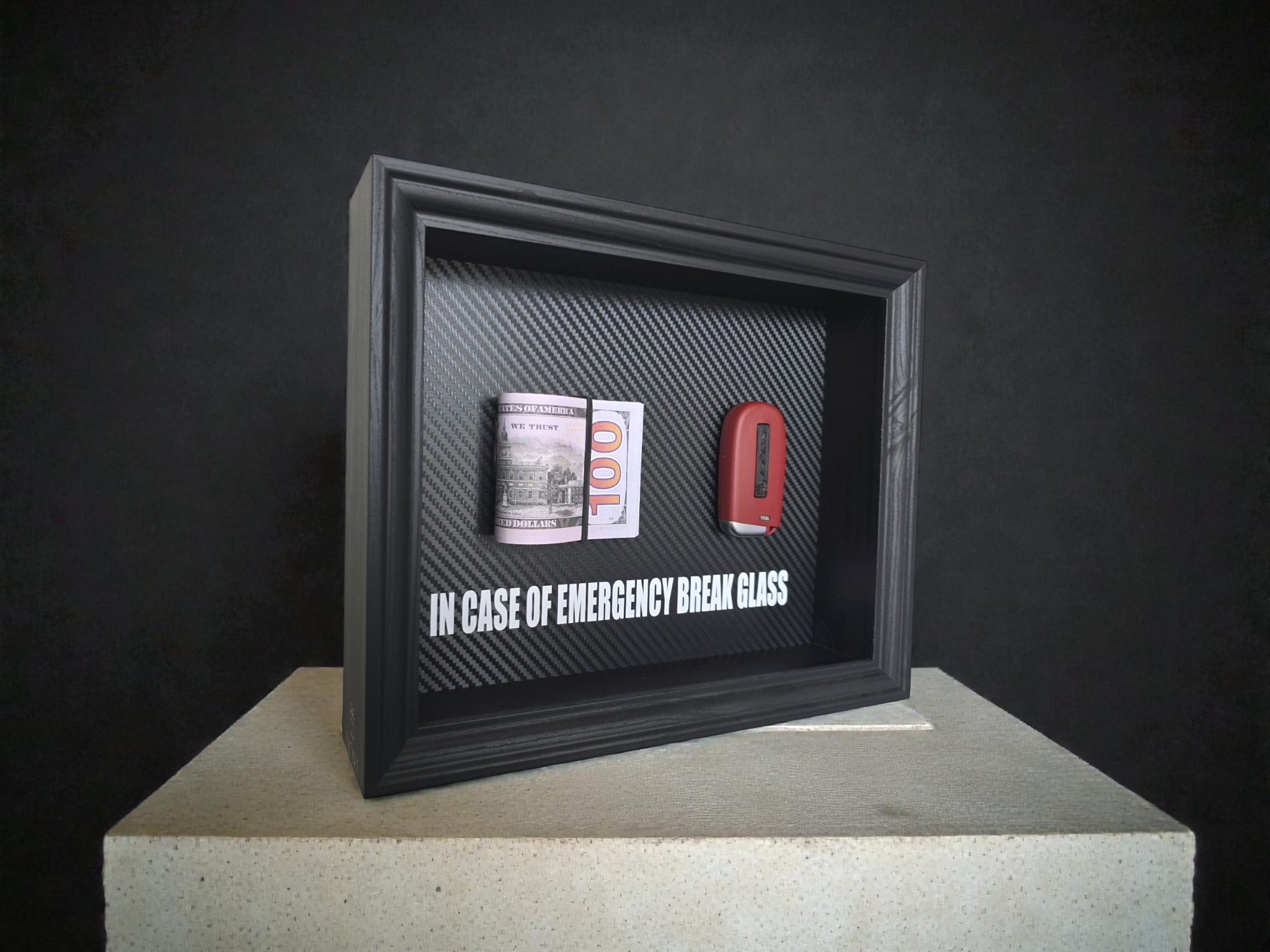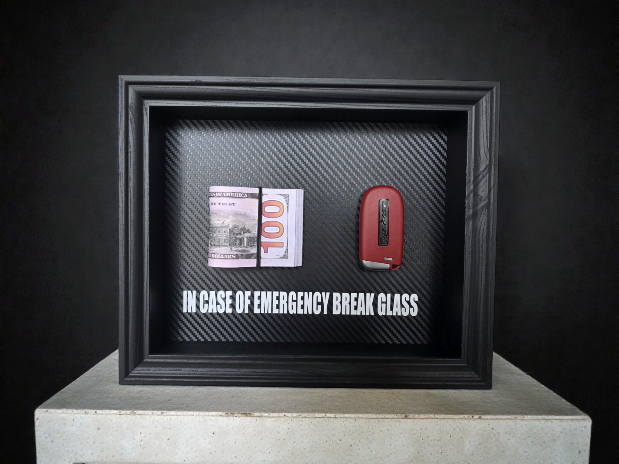 Motyvacinis DORI kolekcijos „Break Glass“ paveikslas su Dodge SRT automobilio rakteliu ir pinigų simbolika. Šis derinys perteikia jėgą, drąsą ir sprendimą veikti be kompromisų, kai svarbiausia – rezultatas.