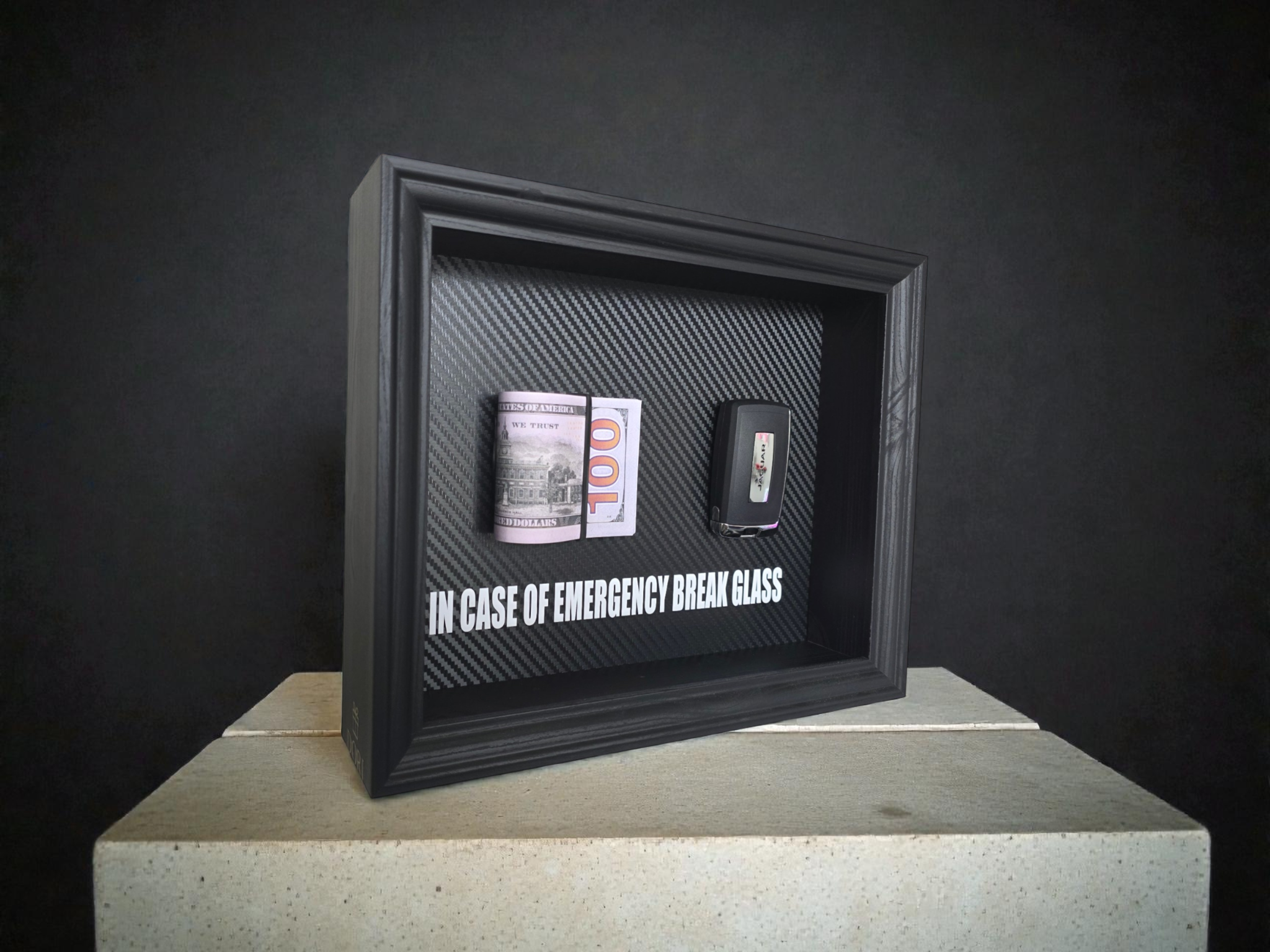 Motyvacinis DORI kolekcijos „Break Glass“ paveikslas su Jaguar automobilio rakteliu ir pinigų simbolika. Šis derinys perteikia ramų pasitikėjimą, eleganciją ir kryptingą siekį tikslo be skubėjimo ir demonstravimo.