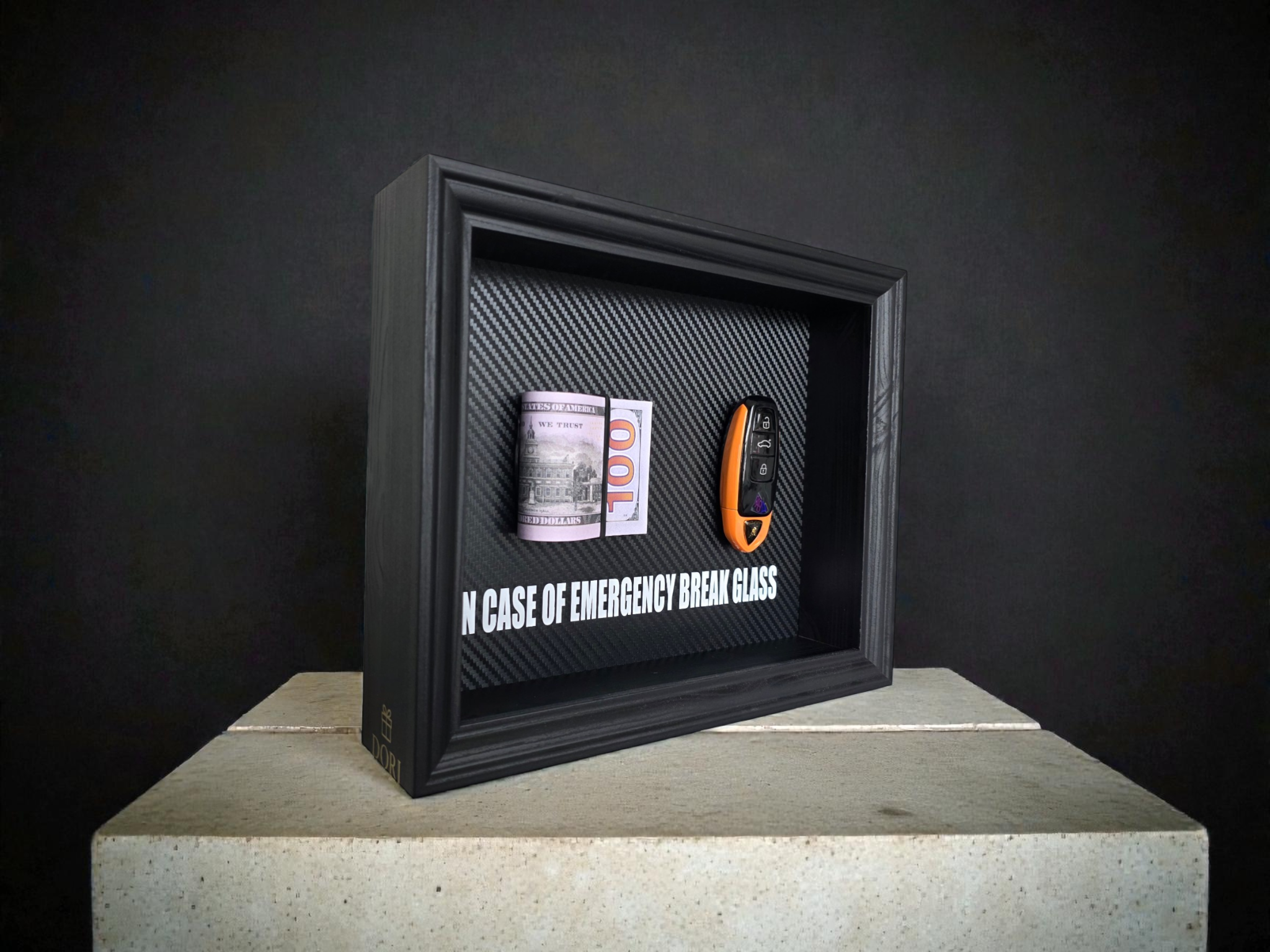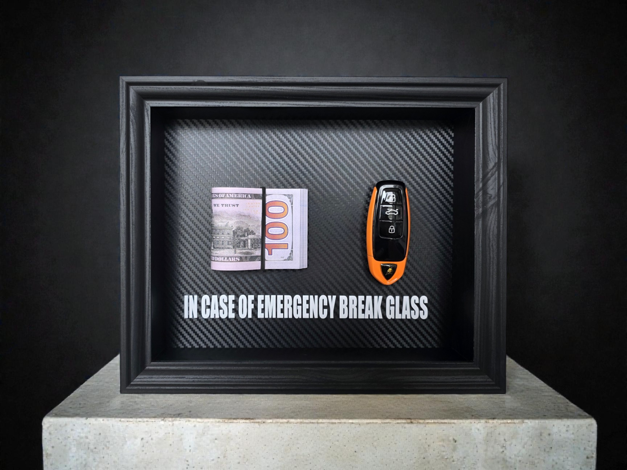 Motyvacinis DORI kolekcijos „Break Glass“ paveikslas su Lamborghini automobilio rakteliu ir pinigų simbolika. Šis derinys simbolizuoja drąsą, ambiciją ir sprendimą siekti maksimumo be atsarginių variantų.